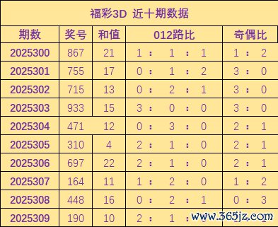 开奖追忆:福彩3D上期奖号为190,其中奖号012路比为2:1:0,和值为10,奇偶比2:1。