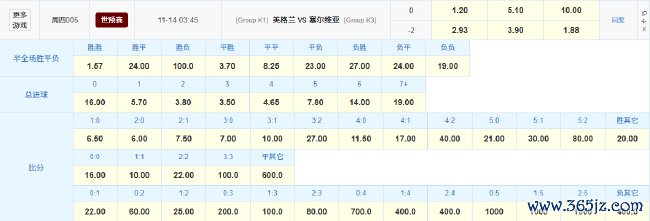 竞彩官方为本场开设单关,胜平负赔率为1.20(英格兰胜)5.10(平局)10.00(塞尔维亚胜),英格兰取胜为超低赔。竞彩半全场玩法,英格兰胜胜赔率最低,为1赔1.57;而在比分层面,英格兰1-0、2-0、2-1、3-0的赔率均在1赔7傍边,足以看出对英格兰取胜的信心。集中对阵两边的球队实力和历史数据,本场比赛看好英格兰队主场轻取塞尔维亚。